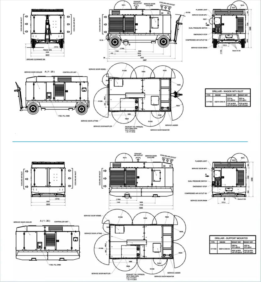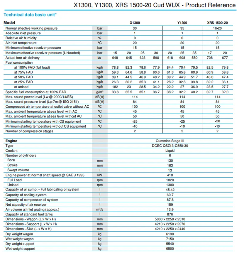 アトラスコプコ X1300、Y1300、および XRS 1500-20 は、水冷式 6 気筒カミンズ ディーゼル エンジンを搭載した消音 2 段オイルインジェクション スクリュー コンプレッサーです。