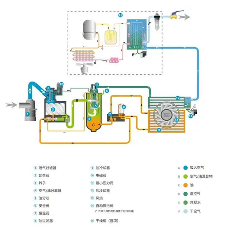 2. 補助システム: 潤滑油システム、冷却水システム、電気制御システムなどを含み、エアコンプレッサーの正常な動作を確保するために使用されます。