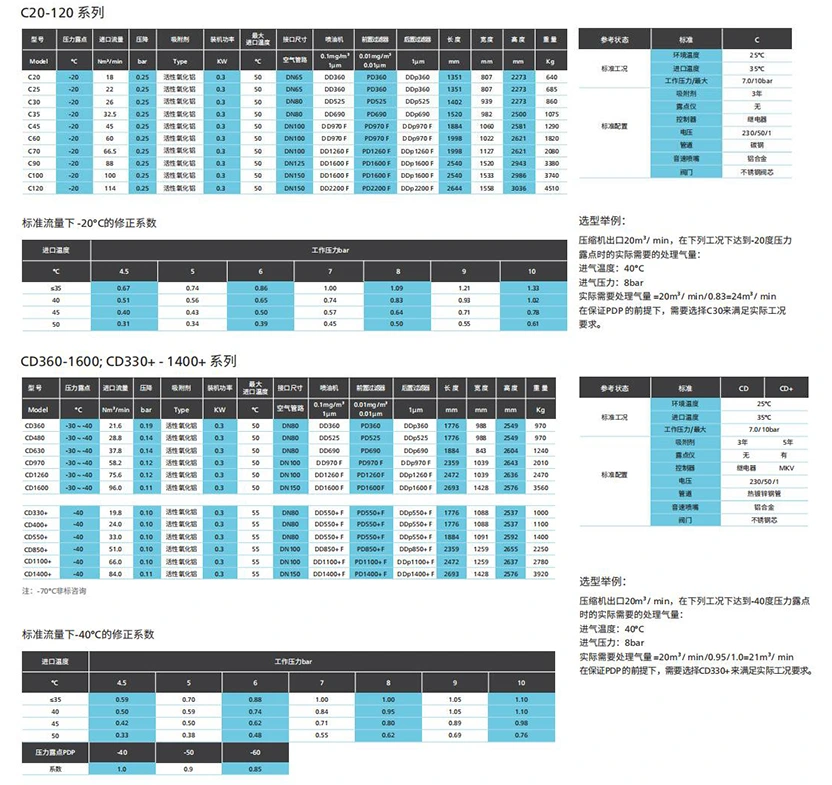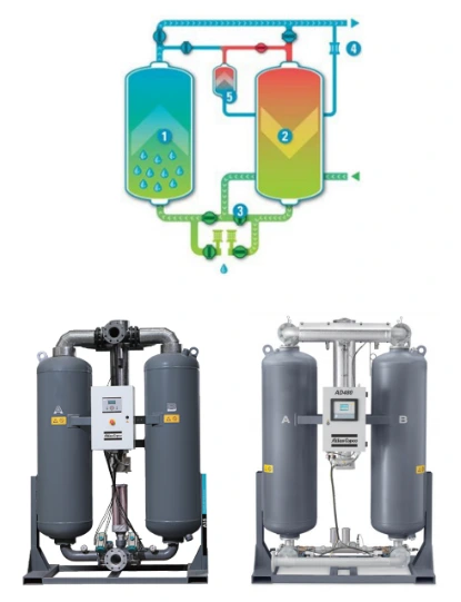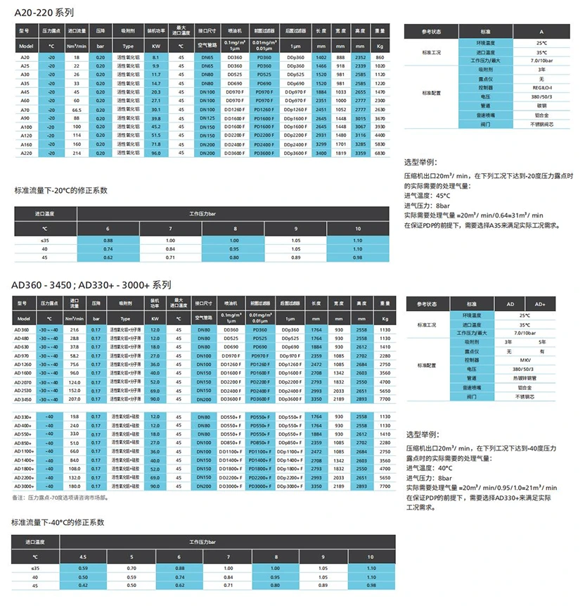 圧力露点に応じて、乾燥剤にはアルミナ、シリカゲル、またはモレキュラーシーブ材料を使用できます。最低圧力露点は -70°C に達することがあります。